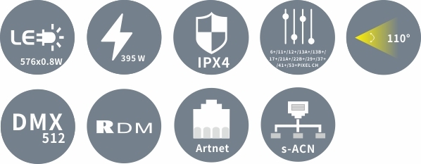 o Источник света: 576 х 0.8Вт RGBW светодиодов o 144 светодиодные зоны могут управляться индивидуально o Выдающийся стробоскопический эффект с переменной скоростью o Малый размер, легкий вес o Плавный диммер 0-100% o Управление без мерцания o Степень защиты: IPX4