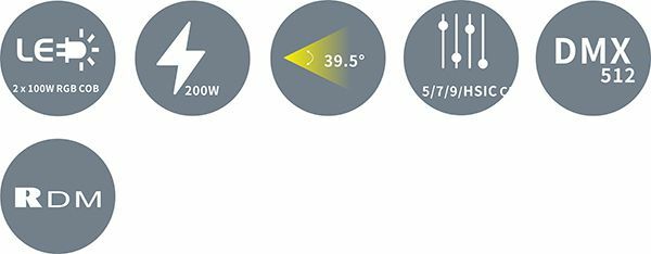 o Источник света: 2 x 100Вт RGB COB светодиода o Срок жизни светодиодов: 20 000 часов o Индивидуальное управление светодиодами o Угол раскрытия луча: 39.5° o Выдающийся стробоскопический эффект с переменной скоростью o Превосходный эффект смешивания цветов o Плавный диммер 0–100% o Несколько блоков могут быть соединены горизонтально с помощью соединительной планки o Управление без мерцания
