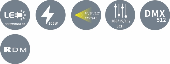 o Источник света: 36х 3Вт RGB светодиодов (20000 ч) o Светодиоды можно контролировать индивидуально o Линзы: 4°/8°/12°/25°/45° o Выдающийся эффект стробоскопа с переменной скоростью o Малый размер, легкий вес o Диммер высокого разрешения 0-100% o Управление без мерцания