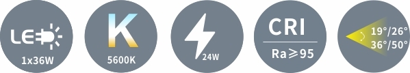 o Источник света: 1*36 Вт CWсветодиод o Цветовая температура 5600±200K o Срок жизни светодиода 20 000 часов o Усовершенствованный оптическая система для обеспечения четких, ярких изображений o CRI:≥95 o CQS:≥95 o TLCI:≥95 o Ровный и равномерный свет o Угол раскрытия луча 19°/26°/36°/50° o Высокоэффективная система охлаждения, позволяющая увеличить срок службы светодиода o Power in/out: кабель o Источник питания с электронным автоматическим выбором диапазона o Мощность: AC 85~127V, 50/60Hz;AC 175~264V,50/60Hz o Потребление: 24 Вт o Размеры: 273x128x100мм o Вес: 1,3 Кг