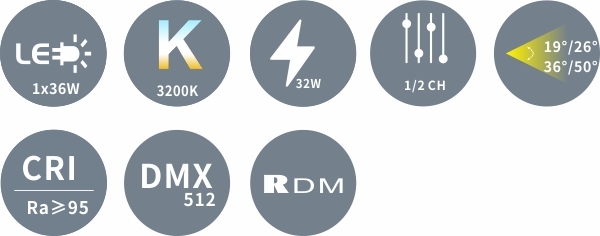 o Источник света: 1х36 Вт WWсветодиод o Цветовая температура3200±150K o Срок жизни светодиода 20 000 часов o Ровный и равномерный свет o Усовершенствованный оптическая система для обеспечения четких, ярких изображений o Высокоэффективная система охлаждения, позволяющая увеличить срок службы светодиода o Управление без мерцания o CRI:≥95 o CQS:≥95 o TLCI:≥95 o Угол раскрытия луча 19°/26°/36°/50° o Управление DMX512, RDM o Каналы:1,2 o Обновления через DMX o Power in/out: кабель o 3-pin XLR in/out o Источник питания с электронным автоматическим выбором диапазона o Мощность: AC 100~240V,50/60Hz o Потребление: 32 Вт o Размеры: 273x158x100мм o Вес: 2 кг