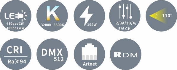 o Источник света: 480 WW + 480 CW светодиодов o Цветовая температура3200±150K~5600±250K o Срок жизни светодиода 20 000 часов o Угол раскрытия луча:130° o Управление без мерцания o CRI:≥94 o CQS:≥94 o TLCI:≥95 o Управление: RDM,DMX512,Master/Slave,Art-Net o Обновления через DMX o Разъёмы Power input o Разъемы 5-pin XLR in/out, Art-Net input: RJ45 o Источник питания с электронным автоматическим выбором диапазона o Мощность: AC 100–240 V, 50/60 Hz o Потребление: 199 Вт o Размеры: 487x148x668мм o Вес: 10 Кг