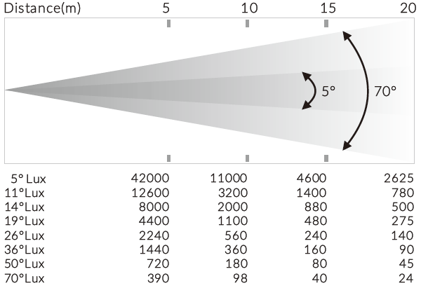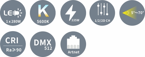 o Источник света: 1*280 Вт CW светодиод o Цветовая температура5600±200K o Ровный и равномерный свет o Варианты линз: 5°/11°/14°/19°/26°/36°/50°/70° o Линейный диммер 0-100% o Стробоскопический эффект и эффект градиентов o Высокоэффективнаясистемаохлаждения позволяющая увеличить срок службы светодиода o Низкий уровень шума менее 25дБ @1м o CRI≥85 o CQS≥88 o TLCI≥90