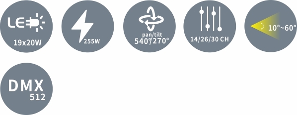 o Источник света: 19x20 Вт RGBW светодиодов o С мощными Beam и Wash эффектами o Индивидуальное управление каждым светодиодным кольцом o Выдающийся цветовой макроэффект o Переменный CTO: 2500K - 8000K o Электронная система линейного увеличения o Зум: 10°~60° o Выдающийся стробоскопический эффект с переменной скоростью o Плавное затемнение 0~100%, 16 бит o Управление без мерцания o Пыленепроницаемая и жиронепроницаемая конструкция o Максимальное количество подключений: