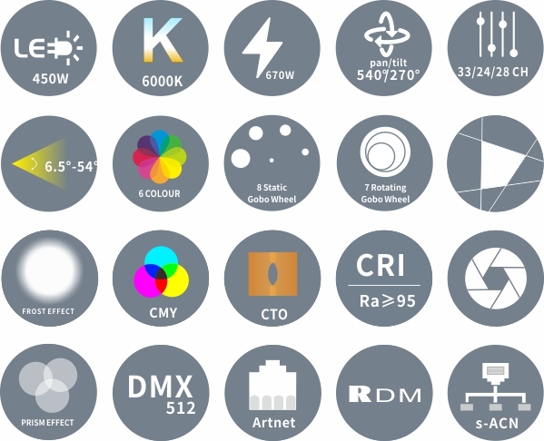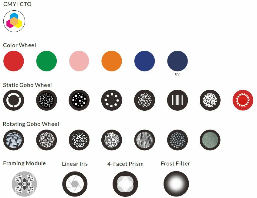 o Моторизированный фокус o Линейное смешивание цветов CMY o Переменный СТО 2700К-6000К o 1 х Статическое гобо: 8 гобо + открытый o 1 х Вращающееся колесо гобо (боросиликатное стекло): 7 гобо + открытый, удобная заменаSLOT & LOCK o 1 х Колесо цвета: 6 цветов + открытый o 1 х 4-гранная призма с возможностью поворота в любом направлении o Угол раскрытия луча: 6,5°-54° o Frost фильтры: 2 х фрост фильтра для создания и улучшения эффекта размытия. Фильтры можно использовать отдельно или накладывать друг на друга. o Моторизированная линейная диафрагма o Усовершенствованная оптическая система для обеспечения качества изображения и четкости o Высокоэффективная оптическая система, коэффициент масштабирования 1: 8,3 o Плавное затемнение от 0 до 100% o Превосходный стробоскопический эффект с различными скоростями o 4 x быстрых и плавных шаттера. Положение и угол каждого лепестка шаттера можно регулировать индивидуально. Каждой лепесток шаттера может полностью блокировать свет. Модуль может поворачиваться на ± 45 градусов. o Управление без мерцания o Пылезащитная и жиронепроницаемая конструкция